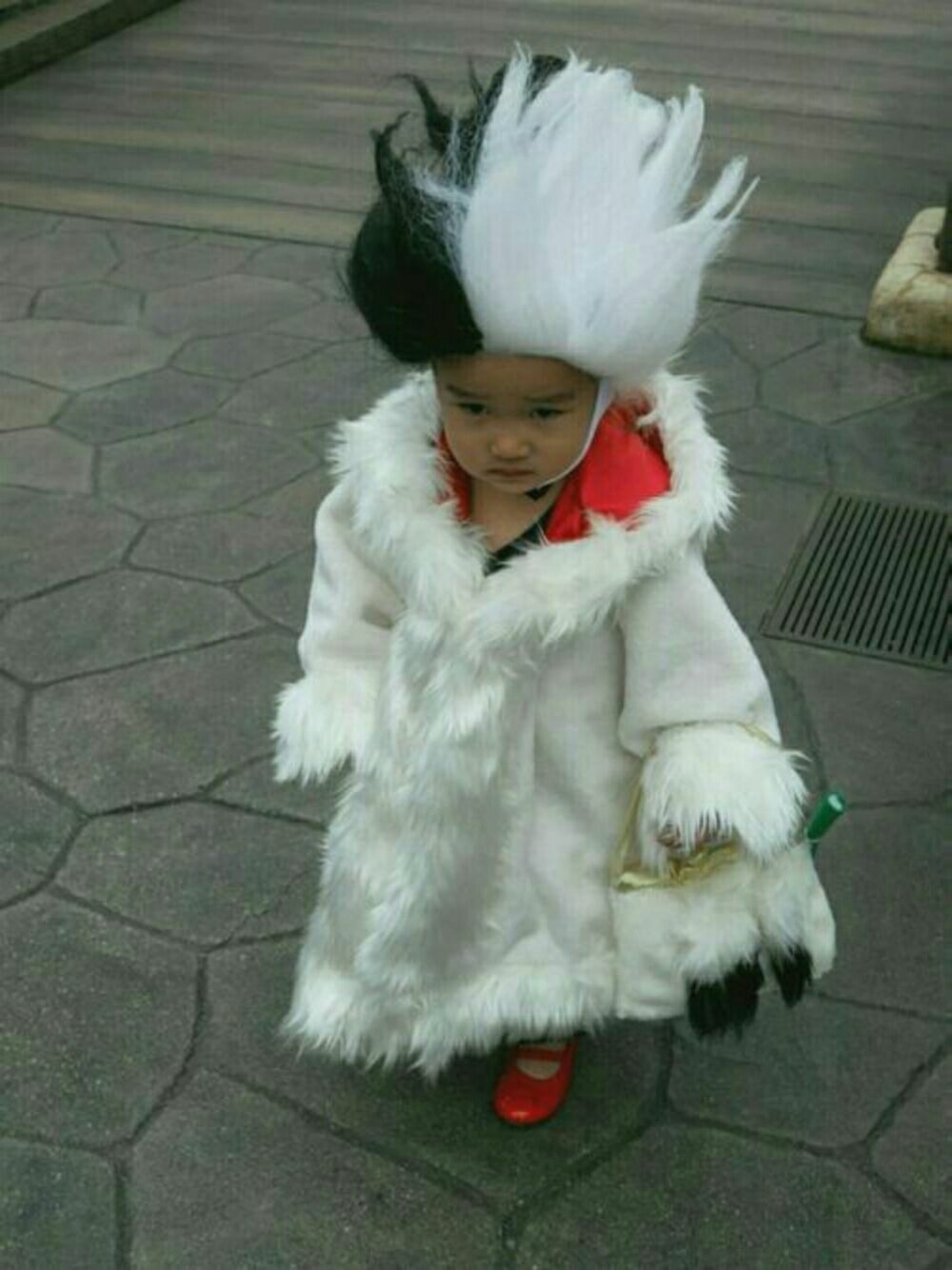 手作りコスチューム✂ 101匹わんちゃんのクルエラ キセルとバッグも手作り🚬 白雪姫の魔女とコラボ🍏
