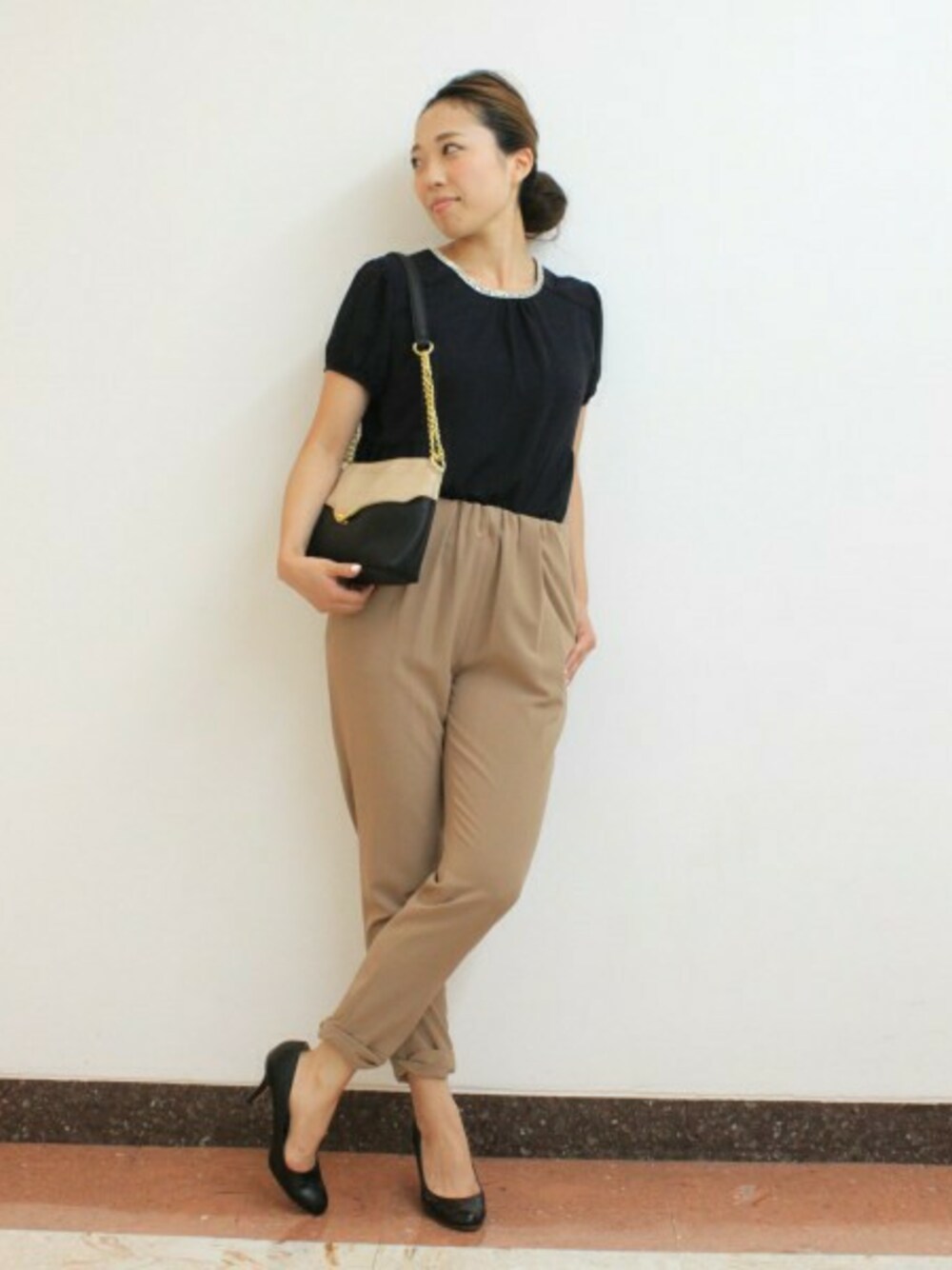 形の綺麗なパンツを主役に、ビジューブラウスをインしてコーディネート。小物使いでポイントをつけて☆