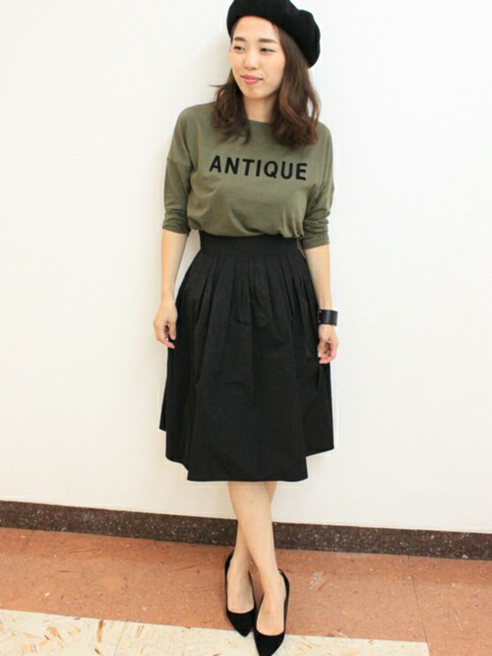 分量感のあるタフタスカートをロゴTで。大人カジュアルコーデ。