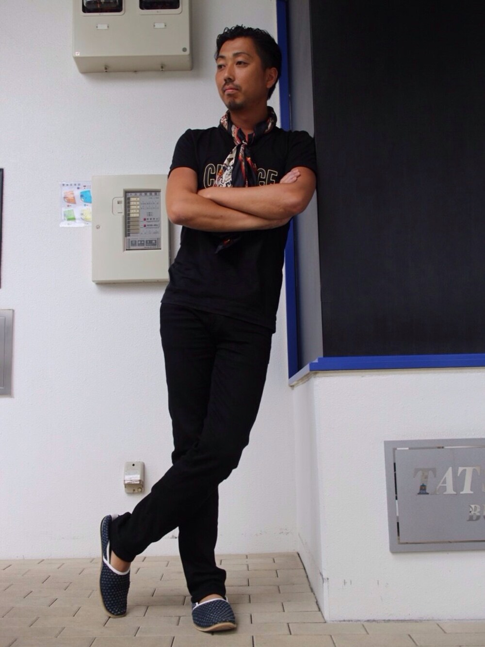 ブラック系のTシャツ/カットソーを着用したメンズの夏コーディネートの1枚目の写真