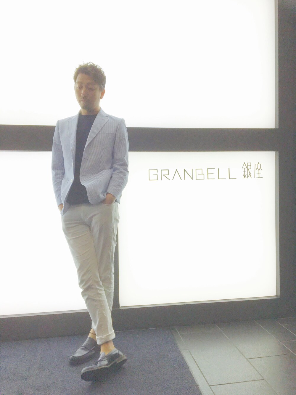 ブルー系のテーラードジャケットを着用したメンズの夏コーディネートの1枚目の写真