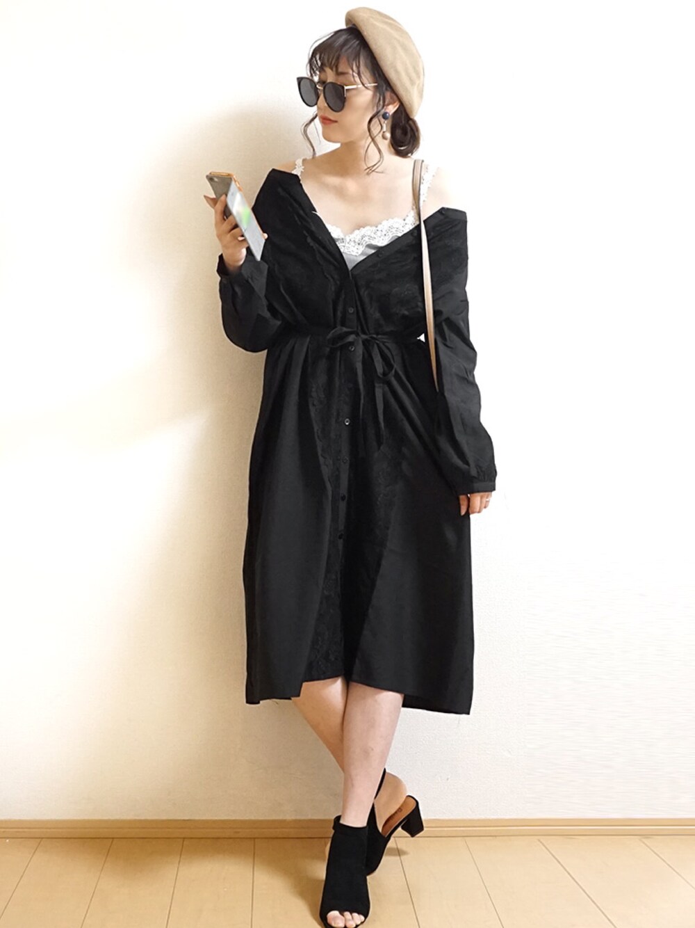真っ黒(^^) ガウンにもなるシャツワンピを 一枚で楽しむスタイル♡