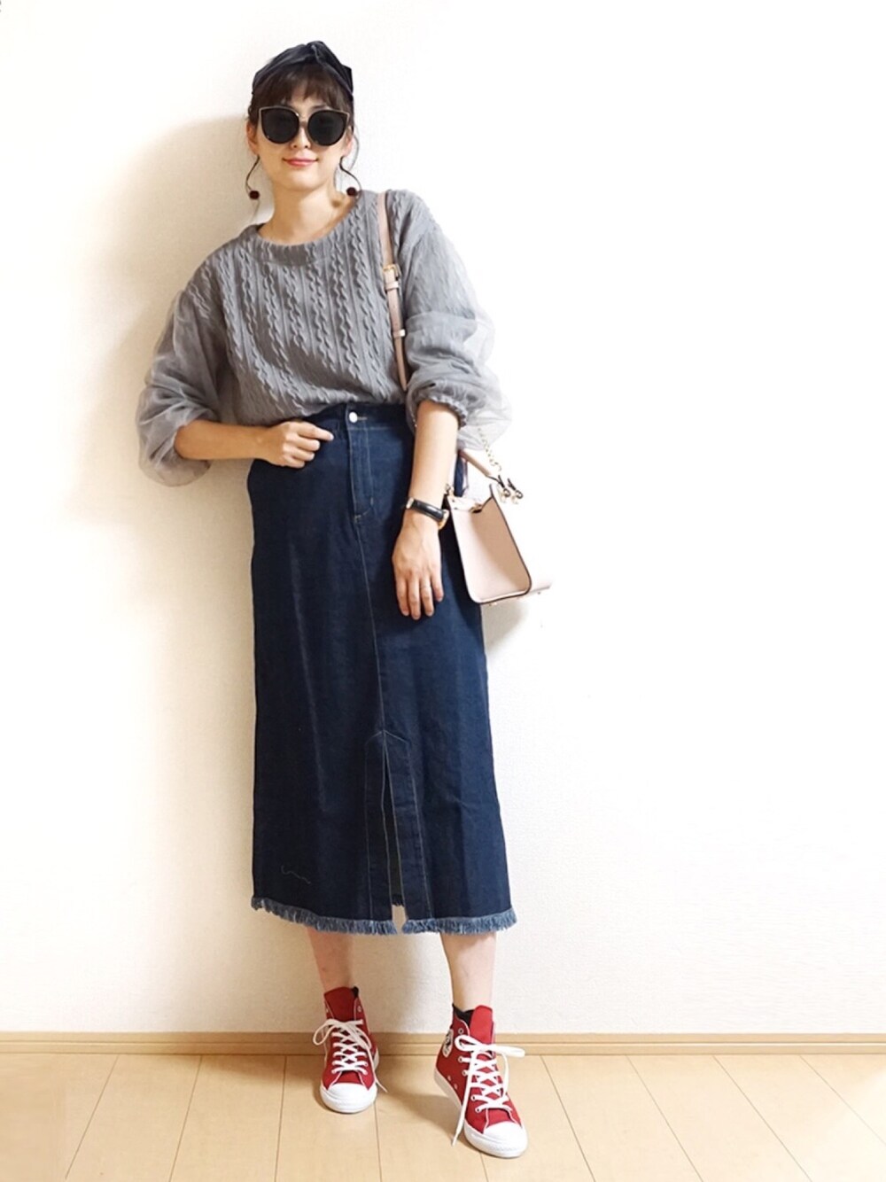 Tiffee のデニムスカート「フロントスリット裾フリンジカット台形ロングデニムスカート」を使ったコーディネート