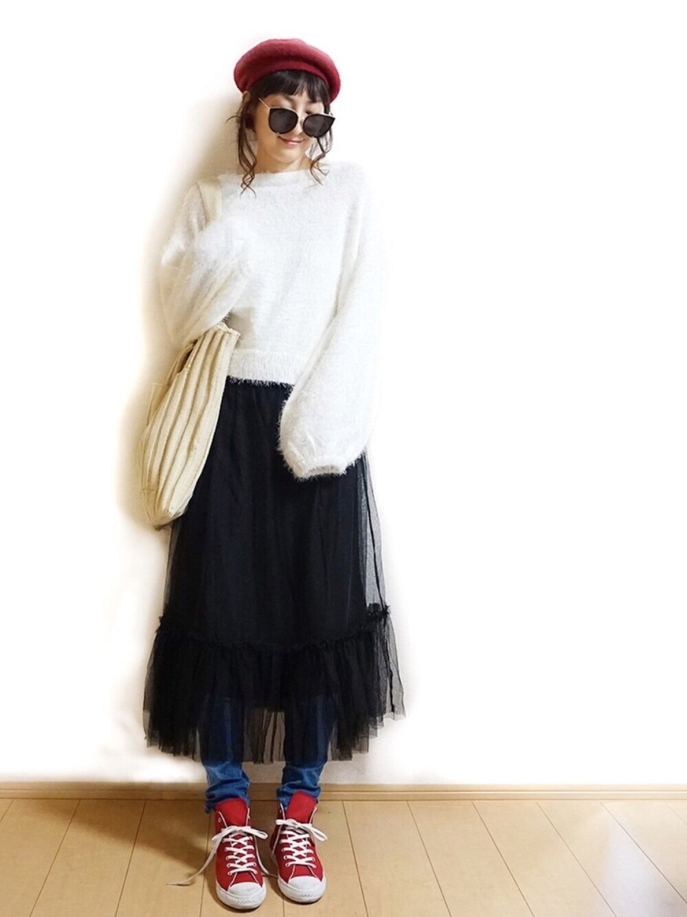 Tiffee のニット/セーター「ボートネックバルーン袖シャギーニットセーター」を使ったコーディネート