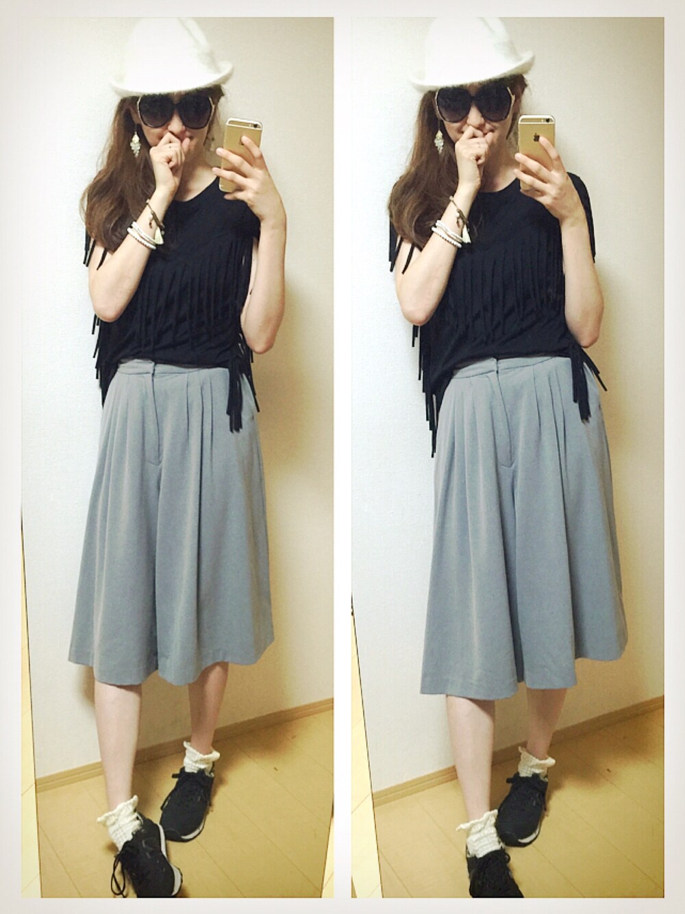 今日は カミさんの神コーデフェスに 参加させてください、コーデ なんてことないツマランコーデで ごめんなさいw フリンジトップス黒×グレーガウチョパンツ いや、スカーチョ? ガウチョ?スカーチョ? どーなんよ?(´Д` ) どちらも今年ゲットしましたー♡ 夏の思い出は レジャーシートを敷いて 旦那はんと妹と3人で 打ち上げ花火を寝ながら見たことかなー♡