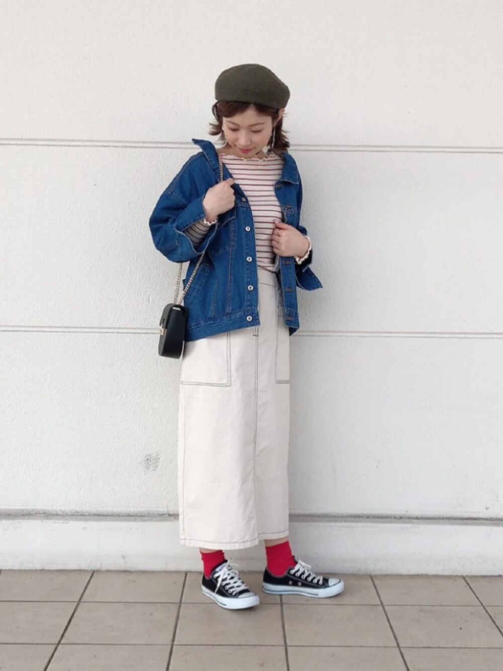 デニム×ボーダーの王道コーデ☺️☘️ こちらのデニムジャケット、 かなり形が珍しいです🎶 今流行りの‘’抜いて着る‘’が出来ます💪💪💪 春アウターまだまだ大人気です😋💗