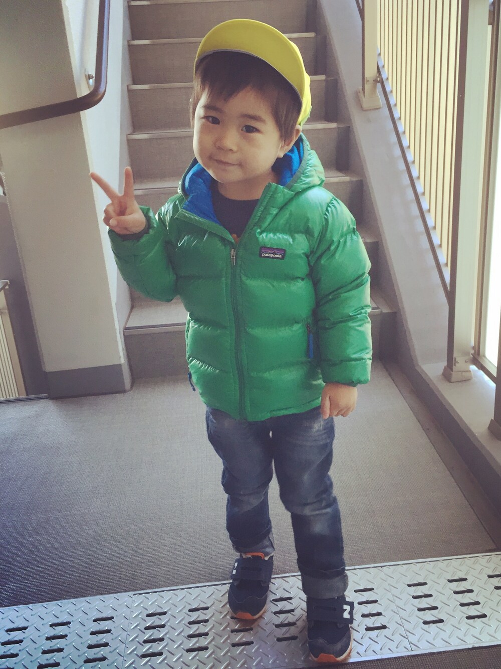 グリーン系のダウンジャケット/コート、ブルー系のデニムパンツを着用したキッズの冬コーディネートの1枚目の写真