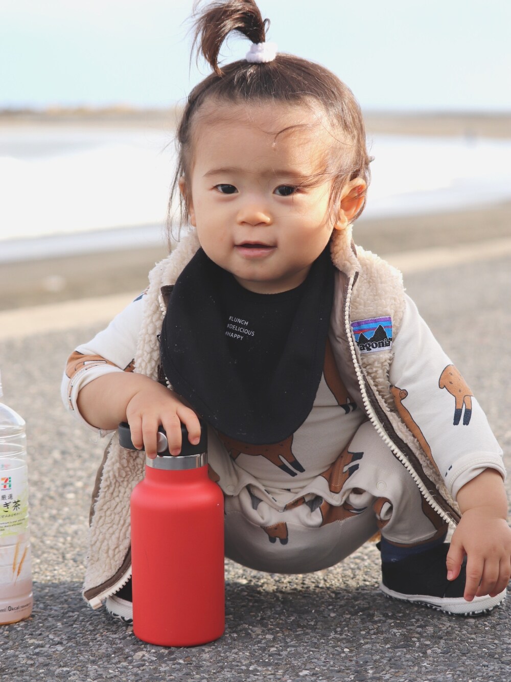 ロンパースもジャストサイズなぼくです。 この日は海にお散歩。 こちらのロンパースはヘタれずお気に入り。