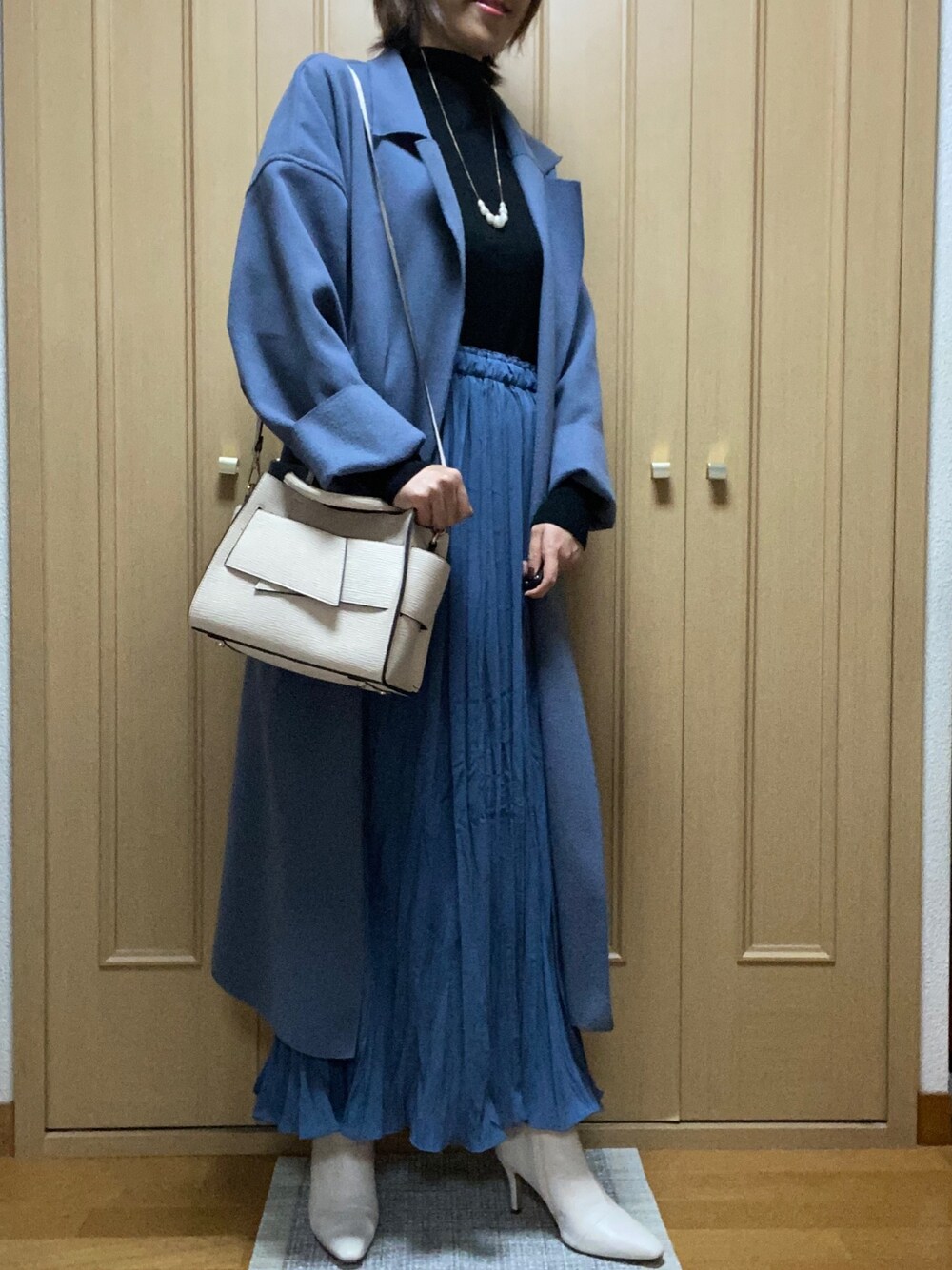 ★new in 新しいアイテムたちを使ってブルー×ホワイトのトータルコーディネート💙🤍 ホワイトブーツが本当に優秀でヘビロテ中!ポイントで合わせられるホワイトのバッグを買い足しました。 これからコートが変わってもこのホワイトの組み合わせが味方してくれそう♡ ブルーが鮮やかすぎるとこのコートの色が汚く見えてしまうのですが、合わせてもかわいいくすみブルーのランダムプリーツスカートもゲット。歩くと揺れて素敵です☺️イエローと迷って長く使えそうなこちらを選びました! 最後にハイゲージのブラックニット。シンプルな黒ニットを探していて、今年らしいハイネックのこちらにしました。お店で3着試着して、一番形が体型に合っているのが決め手でした。生地が気持ちいいです✨