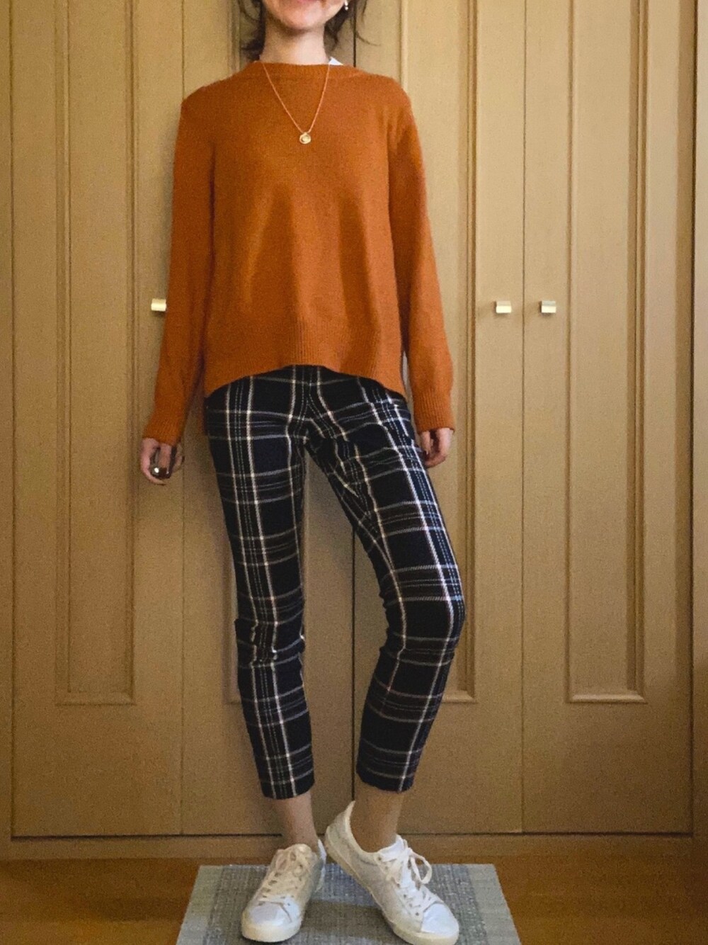 スリムパンツをカジュアルに。 ほっこりブラウンとチェックで暖かみのあるコーデに。 このパンツストレッチも効いてて正座も余裕✨走り回らなきゃいけないママさんにもおすすめのコーデです☺️