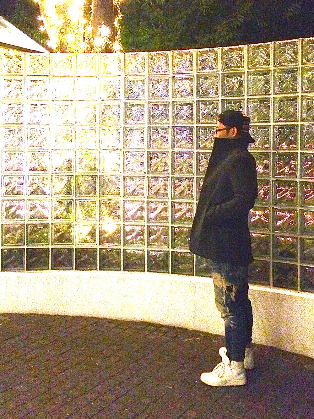 後ろかぶりのキャップ:クイックシルバー グレーのコート:無印良品 デニム:diesel スニーカー:adidas