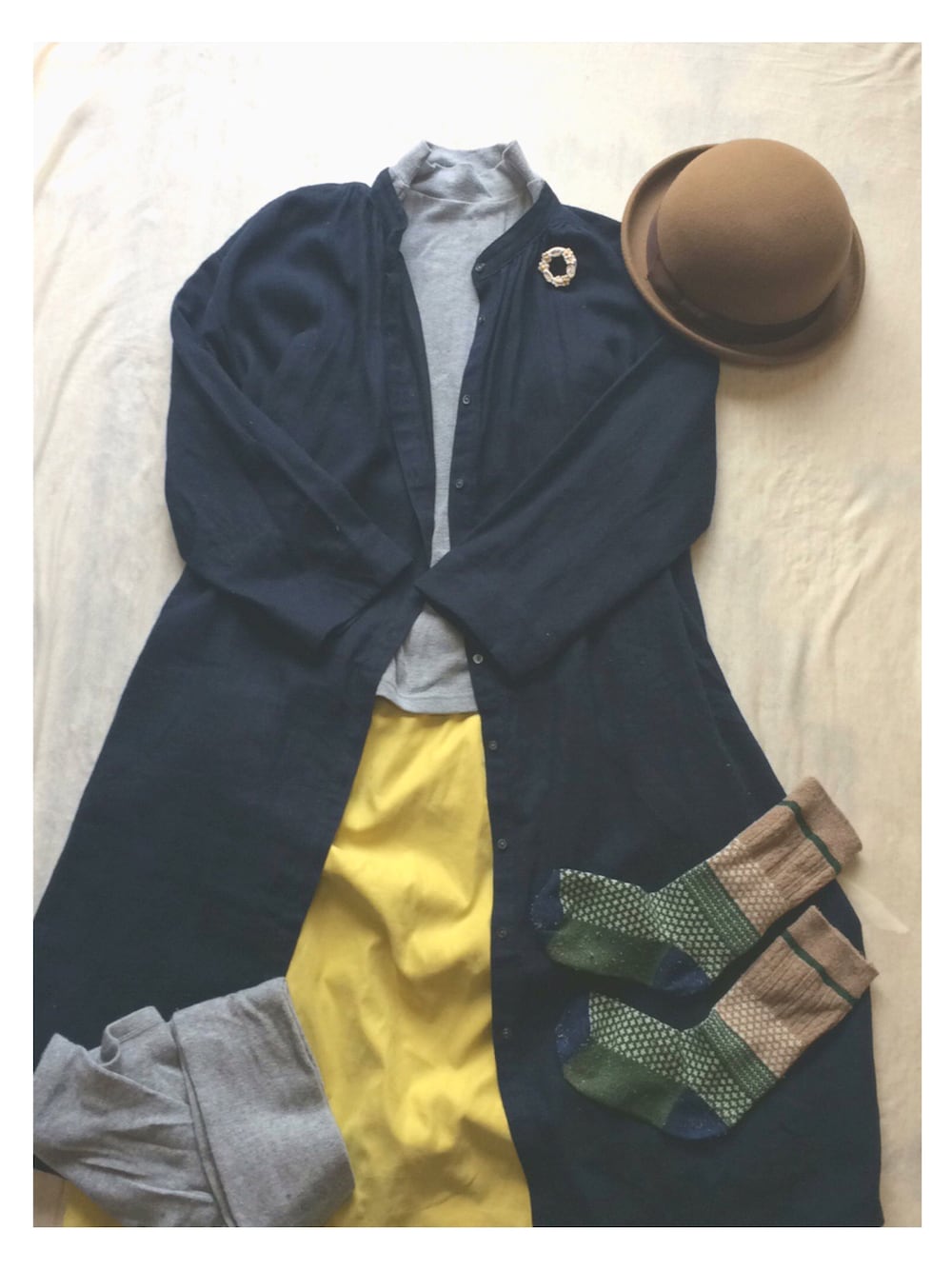 黄色のスカートをポイントに 。 黄色×グレーの組み合わせ 好きです 。
