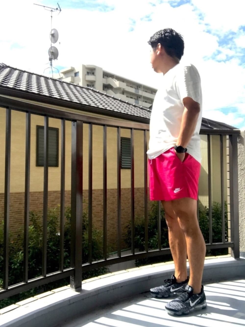 台風目前の晴れ間🌞 ユニクロユークルーネックT × ウーヴンショートパンツ × ヴェイパーマックス3フライニット ウーヴンショートパンツどハマり中。 少し目立ちたかった時はこの色w いくつ迄履けるかな......