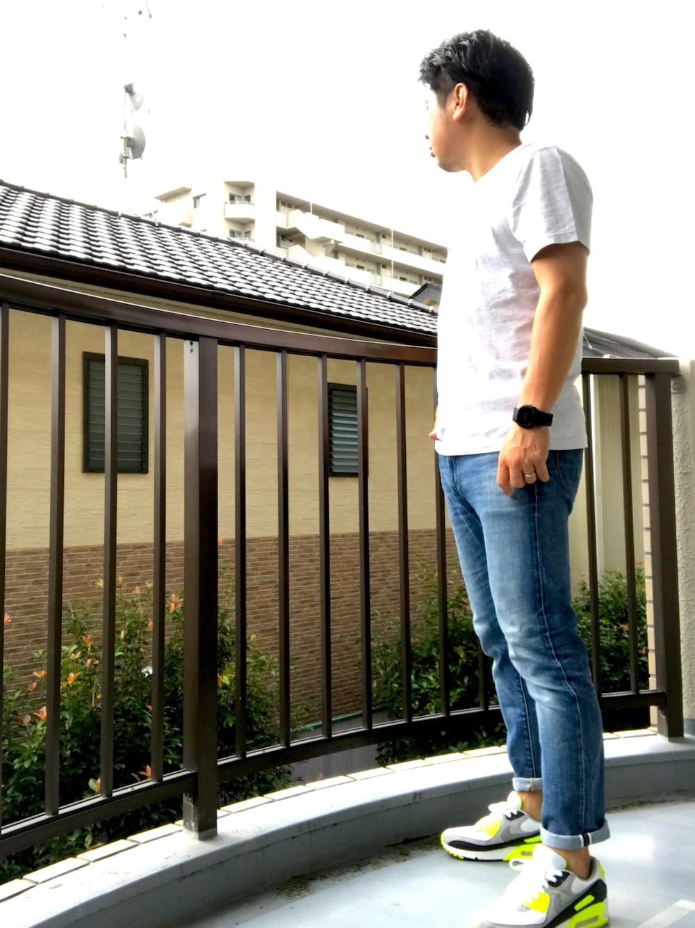 季節感を出さねばと言う事で短パン卒業😭 ユニクロユークルーネックT × スキニーストレッチセルビッジジーンズ × エアマックス90ボルト ほぼノームコア化している組合せ。 ここ最近ずぅーっとLを着ていたので Mがキツく感じるw でもやっぱりまだ暑いな。