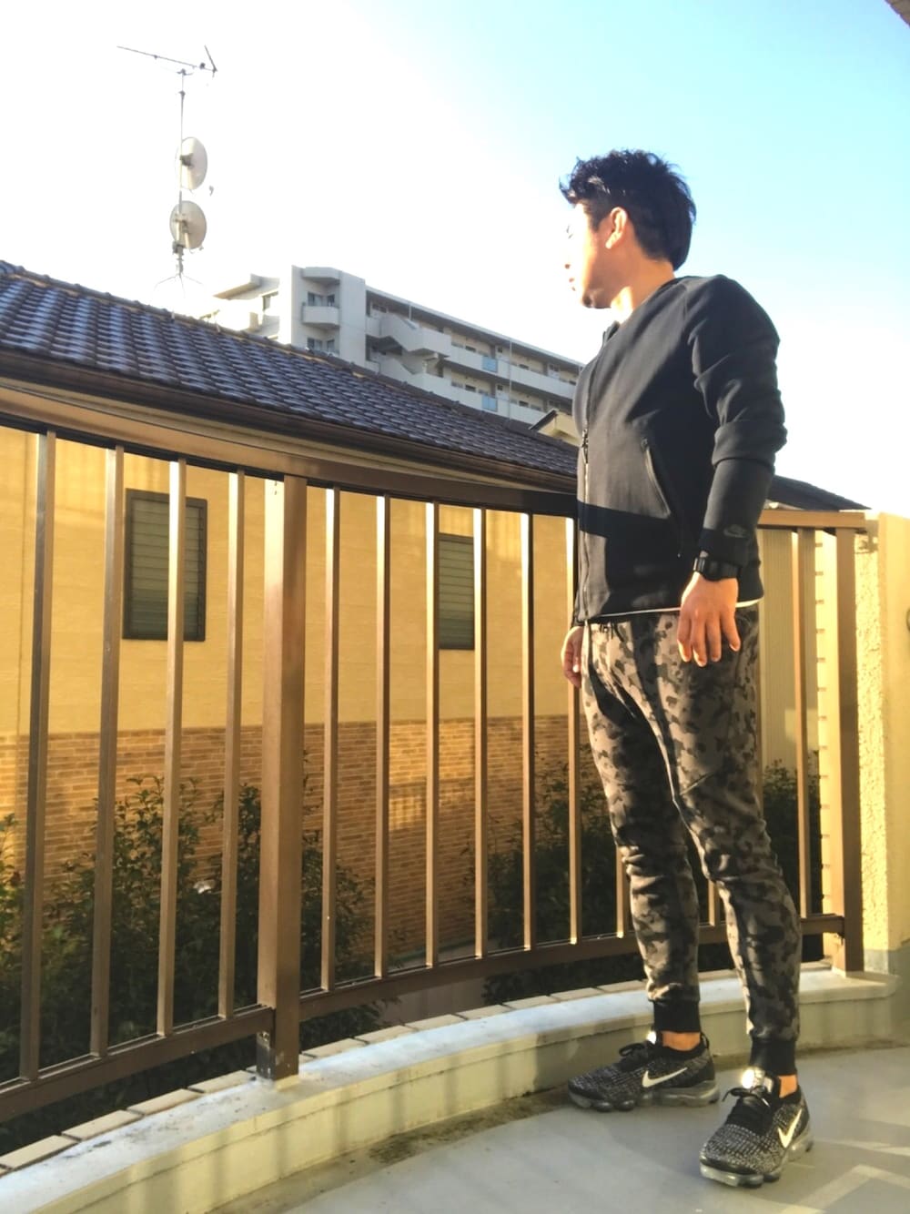 相変わらずの11月らしからぬ気温w テックフリースジャケット × テックフリースジョガー × ヴェイパーマックス3 全体的にダークトーンで落ち着いた感じにしたつもりだと思いきやカモフラがしっかり煩いね、とw トップスのダブルのライダース風のジャケットがなかなか面白いかな、とw 今日はjrの発表会なので気合バリバリです! 頑張れ愚息よ!!