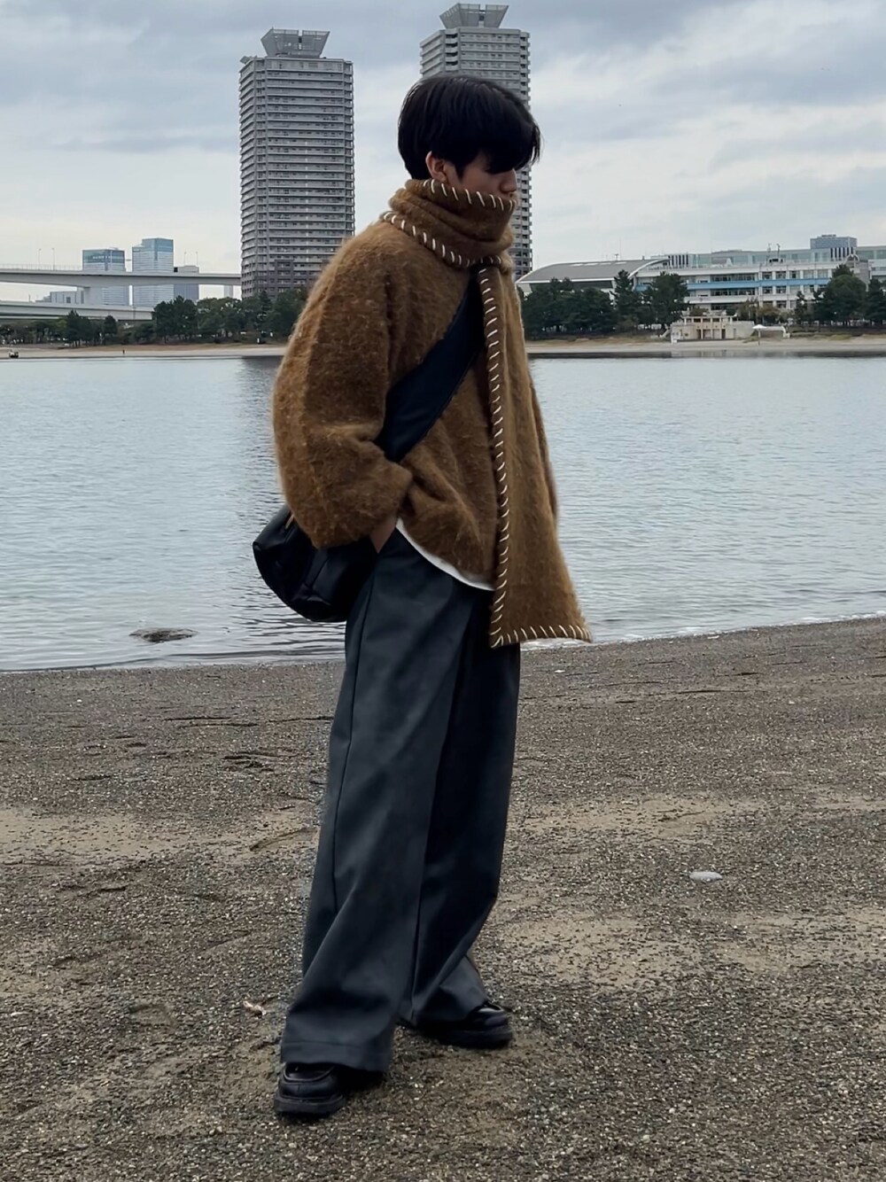 ニットコーデ。 寒くなってきたのでマフラーを。 マフラー付きのこのニット、ブークレ素材で軽いから方が凝ったりする感覚がないのが良い😌
