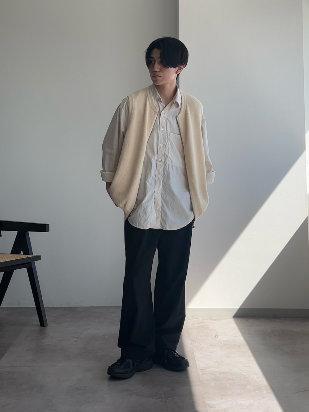 シャツにベストを重ねたレイヤードスタイル。 似た色どうし重ねると調和して違和感なくお洒落できる🫶