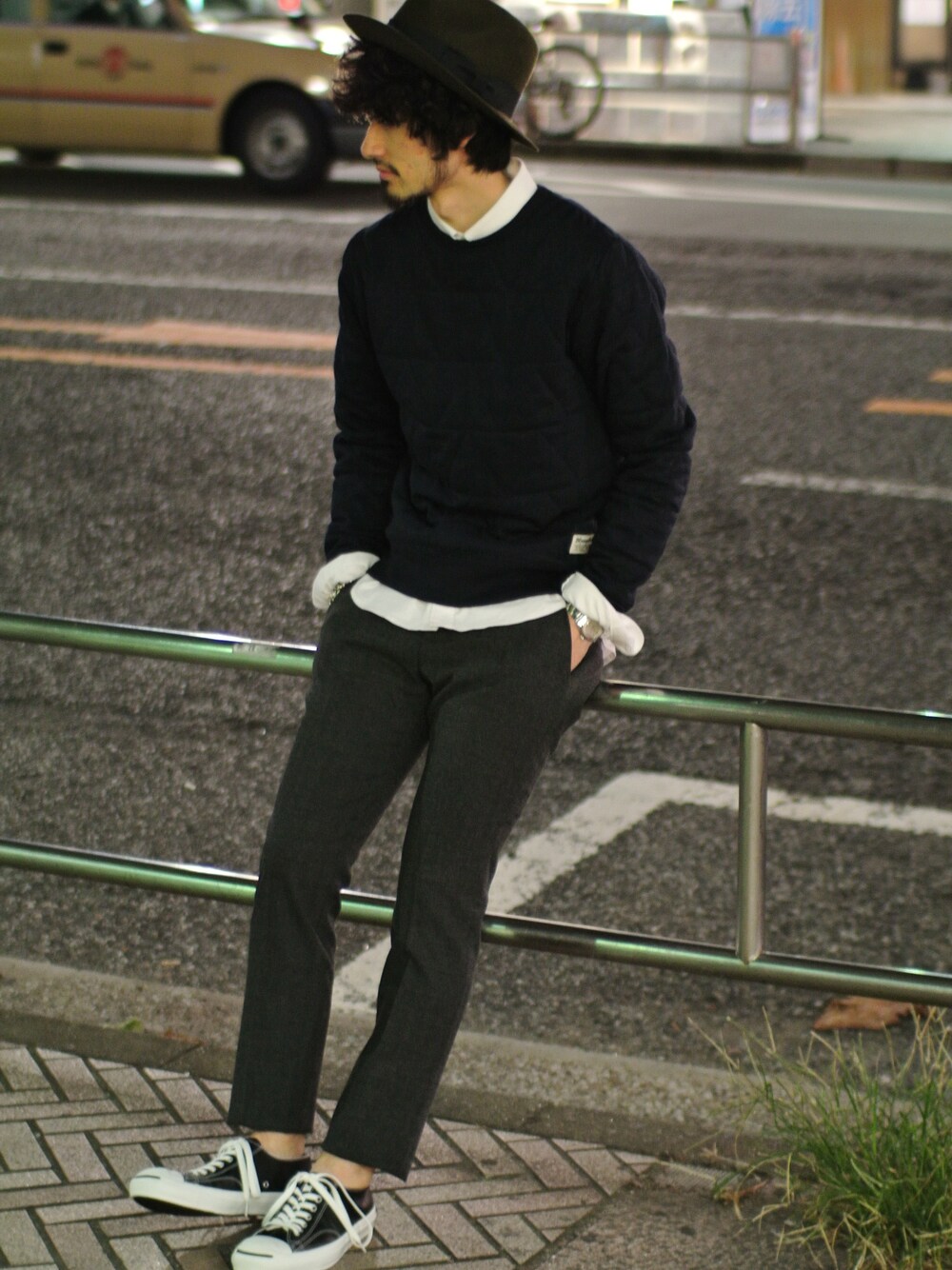 SHIRT:MAIN VEIN ¥11,000- SWEAT:LA panoplie ¥24,000- SLACKS:MAIN VEIN ¥12,000- SHOES:CONVERSE ¥9,500- 「Big Hat」 ツバ広HATムーブメントはすごいですよ。 もうSHIBUYAは一日に何人被ってるかわからないくらい。。。 それなら合わせ方で変化出したいですよね。 今回はスラックスにスニーカーという僕らの一番気分な着こなし。 スラックスってちょっと品よく見えるし、スニーカーはラフな感じに見えるから、 そのいいとこどりかなって!! そんなスタイルに「Big Hat」も合いますよ~♪