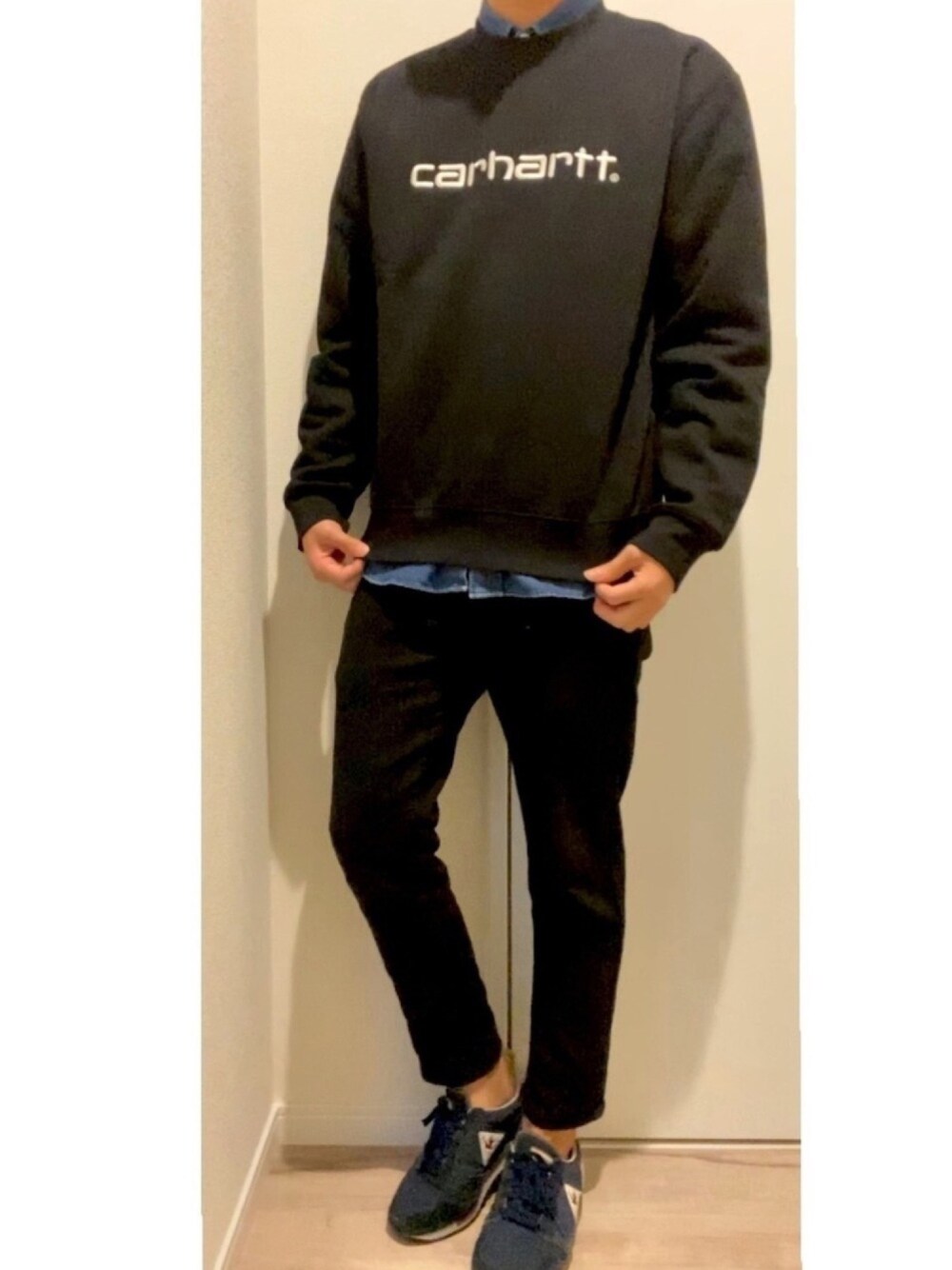 おはようございます☀ お気に入りのカーハートのスウェットです! 上下黒なので差し色にポロのデニムシャツを中に着ています! いいね、フォロー、save、コメントよろしくお願いします🤲