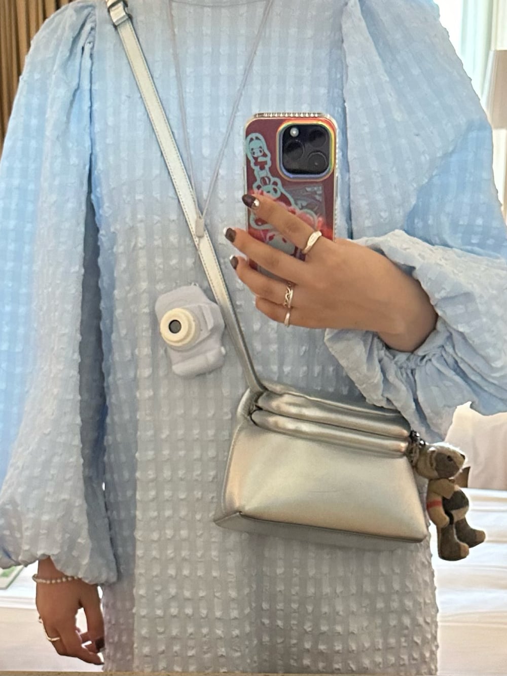 頂き物のワンピースに3coinsのトイカメラ 服もおもちゃも水色だったから 写真には乗ってないけど靴も水色にして 全身水色やった🩵 お気に入りの合わせに更新されたから次は全身撮りたい〜🥲