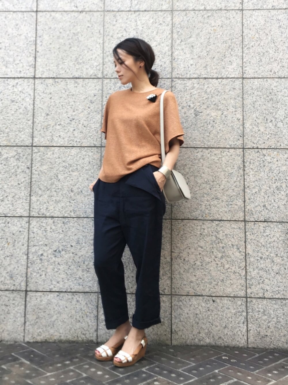 だいぶん秋めいてきました。 (明日は東京33℃らしいけど…) mhairiのリネンのパンツは シンプルだけど、アシンメトリーな 折り返しのデザインが 気に入っております☺️ Steven Allanのトップスに ブローチを重ねづけして✨