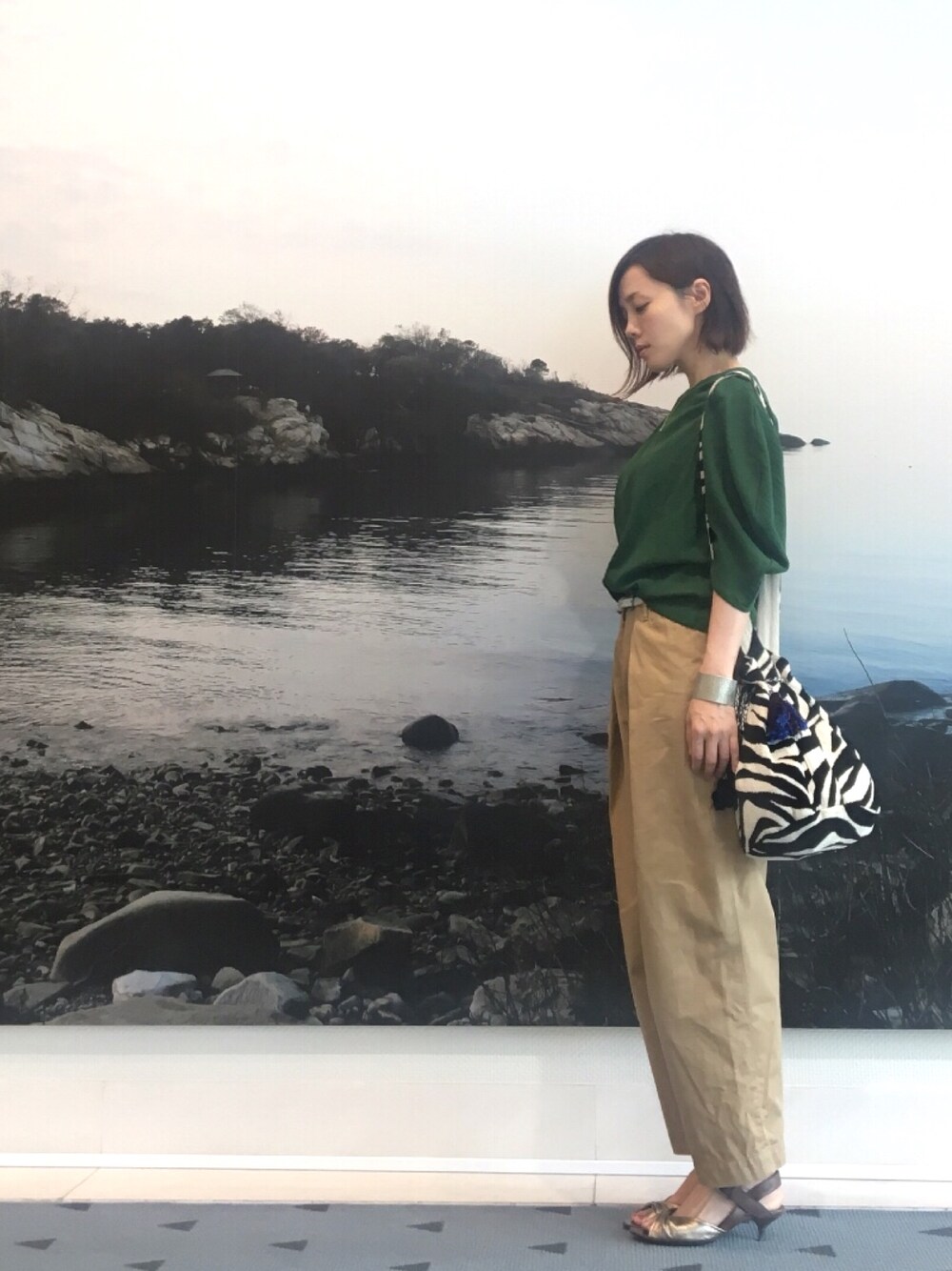 昨日の格好です。 たまたま立ち寄った場所で バージニア・リー・バートン展 (絵本作家)やっていて、これは アトリエの近くの写真だそう。 なんだか不思議な写真になりました😳 グリーンは珍しいのですが 袖のデザインが気に入って ZARAで買ったもの。 チノパンを合わせて☺️