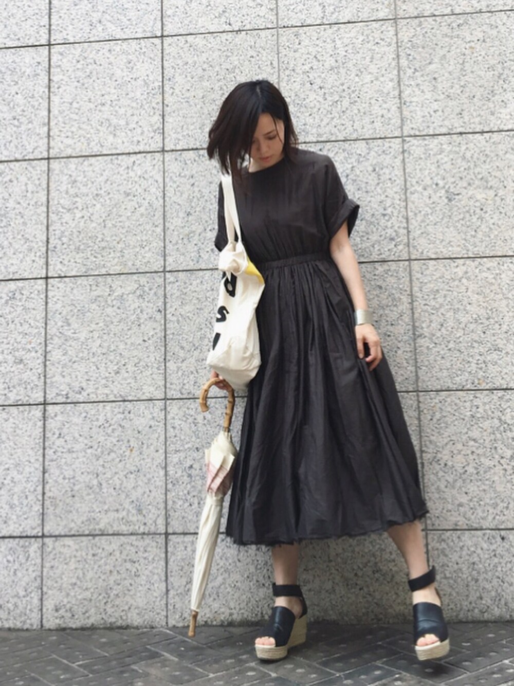 ちょっと前の格好です。 このワンピースを着るときは 極力シンプルにしたくなります😽 帽子を頭に載せてることさえ 暑く感じたので日傘の一日でした☂️☀️