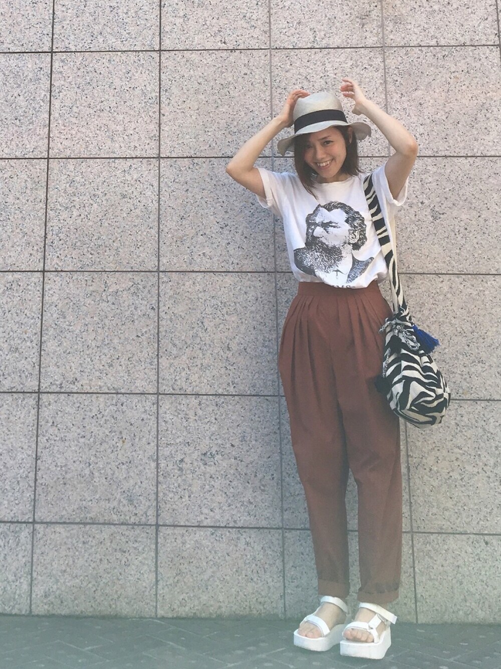 昨日の格好です。 「お母さん、なんか白い、白いよ」 と写真を撮ってくれてる息子が ぶつぶつ何を言ってるのかと思ってたら 写真にモヤかかってたのね…😑 お店で試着したものの 購入までは至らなかった ドレステリアのパンツが お安くなってたので購入🤗 ブラームスTを合わせて。
