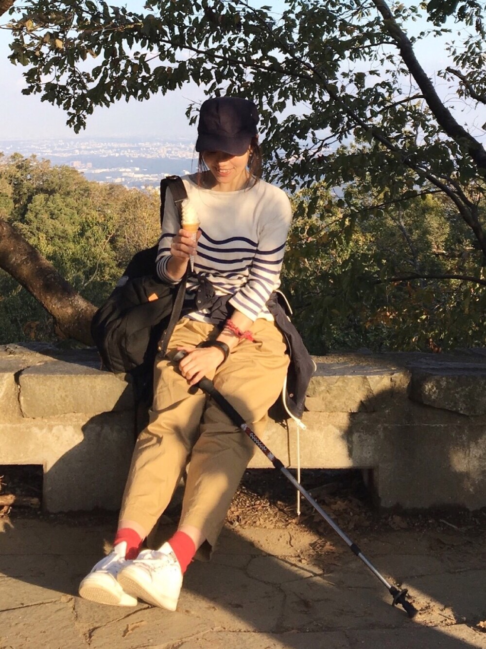 ちょっと前の格好。 高尾山の頂上にいます。 ガッツリ登山ではなく リフトを使って薬王院など 立ち寄ったりの観光登山だったので ずいぶんラフな格好です☺️