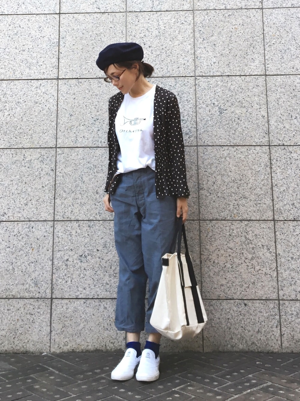 今日の格好です。 トランペット🎺Tシャツに 水玉のブラウス。 まだまだ暑いので ベレー帽は夏用メッシュの😙