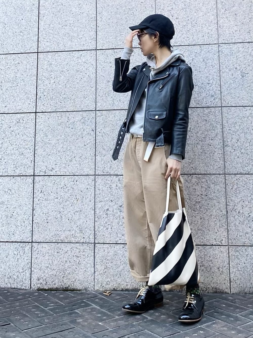 パーカーにゆるパンツ。 ライダースが引き締めてくれます。