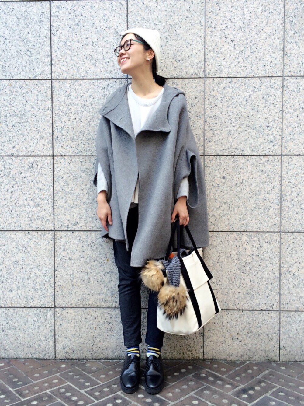 sneeuwのサルエルパンツは わかりにくいですが左右微妙に 違う生地で、黒・グレーで 色も違います。 ここの服、とぼけた感じと クールさのバランスがツボで 毎年チェックしてます😘 プフッツェというアクセサリーも 同じ理由で好き。 個展の案内が来るたび行って なんかしら買ってしまうー😝 マントは10年くらい愛用してるやつ。
