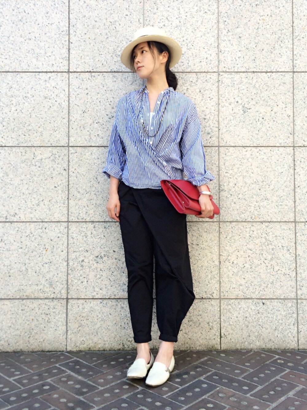 いつも上のボタンまでぴっちり とめるmanonのシャツ。 今日カシュクールに出来ることを 知りました😂得した気分ー。 アシンメトリーのパンツ 相当気に入ってます。 全身真っ黒で着てみたくなります。