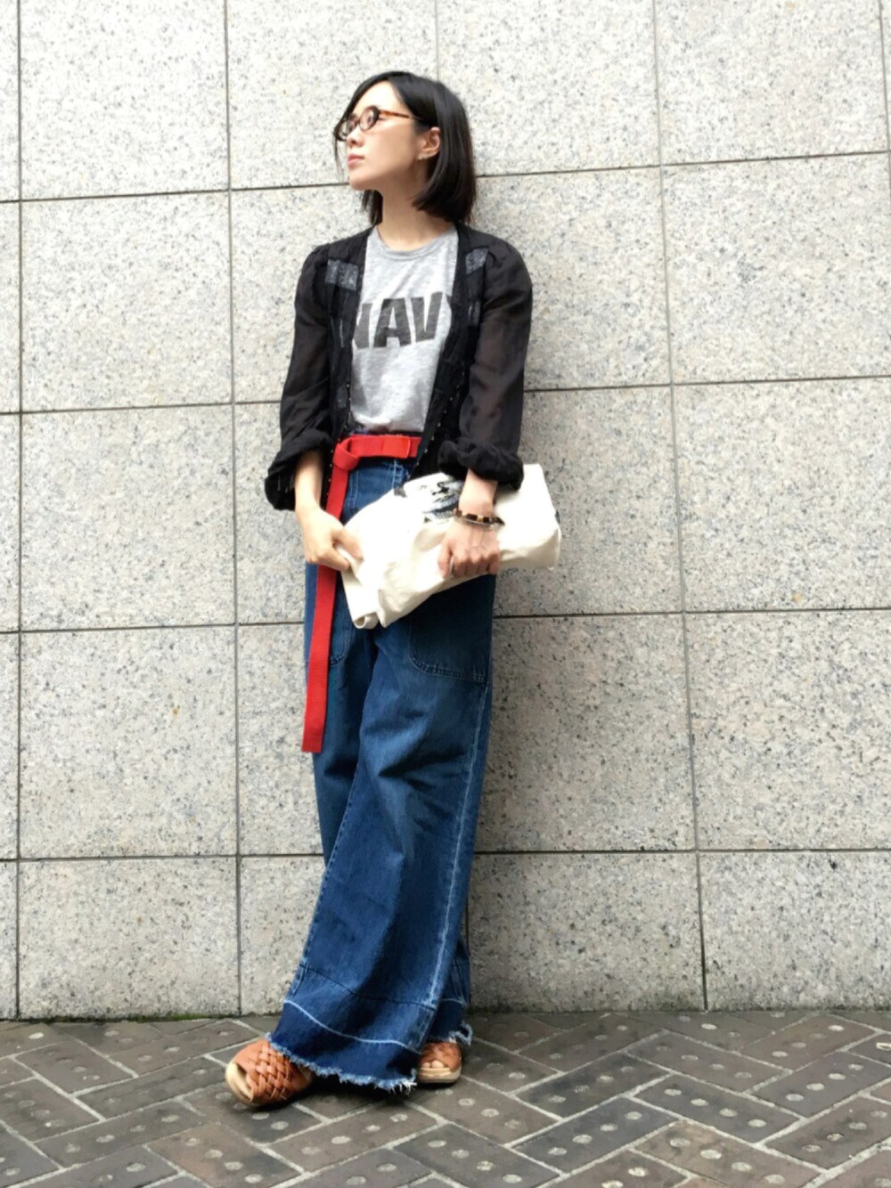 昨日の格好です。 ワイドパンツでトップスはコンパクトに☺️ デニムは裾が長く、サボサンダルも しっかりかかとがあるので ベルトは思い切り長く垂らして😚