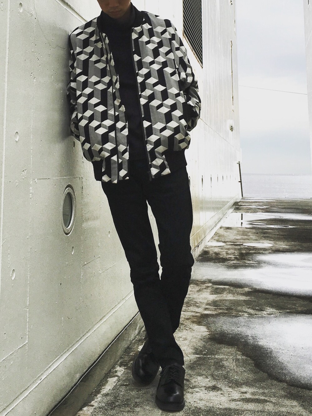 エトセンスの幾何学ブルゾンを使ったコーデパート②! 今回はITTYBITTYのハイネックを合わせました。 やはりブルゾン、ライダースにはハイネックが合います。