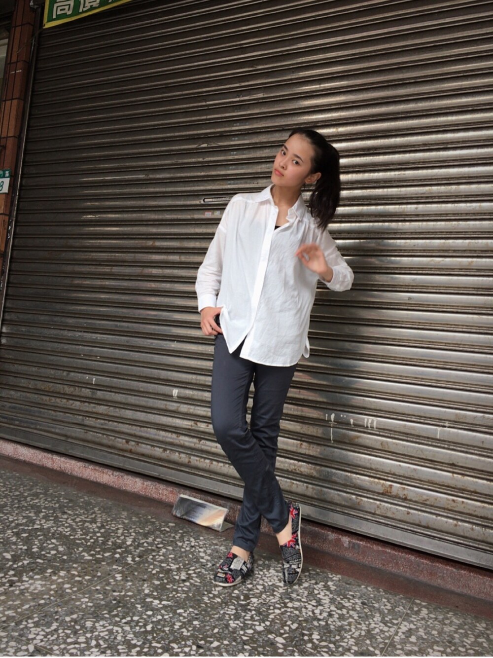 襯衫給人有種莊重的感覺,因此,搭配懶人鞋可以穿出較休閒的感覺,帥氣啦哈哈哈😎
