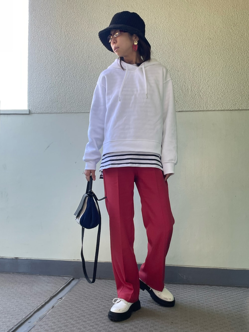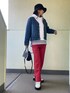 【赤パンツpart2】 #gu購入品 の #センタープレスカラーストレートパンツ ¥1990 #ロープベルト ¥590 #スウェットプルパーカー ¥790 インナー #ボーダーロングスリーブt ¥1290 靴 #ボリュームソールレースアップシューズ ¥990 バッグ セカンドストリートで購入 ¥990 アウター #gramblue #裏ボアgジャン ¥1991 アクセ @_innocence_by_mimi