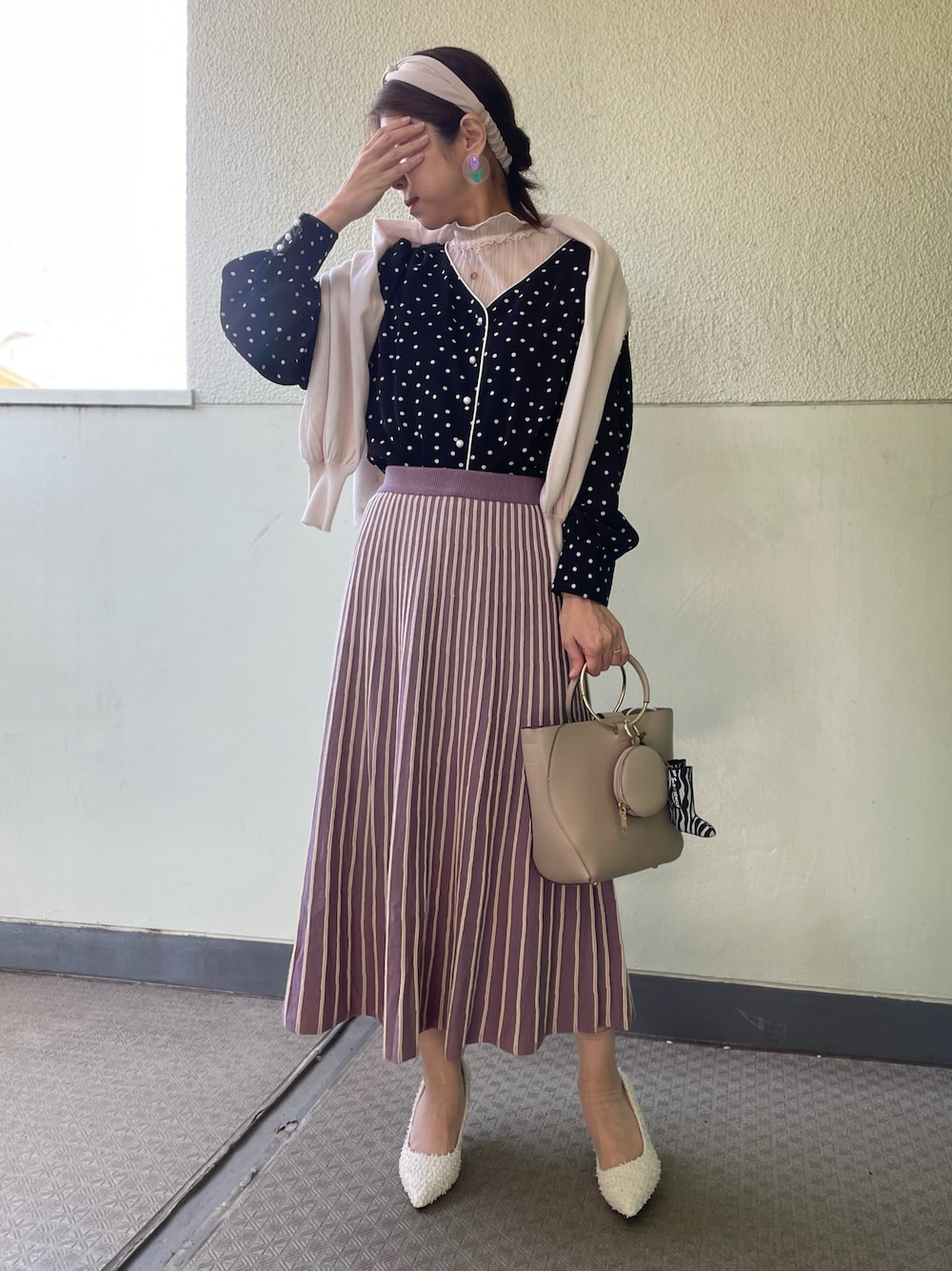 【虹色🌈コーデ最終日】 本日は紫💜 &肩かけを一度やってみたくて初挑戦❣️ いいね、フォルダイン、フォロー嬉しいで背😊 基本プチプラコーデです✨ 肩かけなしverは2枚目😊 トップス one after another NICE CLAUP 配色パイピンクブラウス しまむら購入品 シアーインナー ¥1089 バッグ ¥1969 佐渡潜水さんからバッグのおまけでもらったゼブラの長靴ストラップをそっとつけてみました🤣 スカート grove 配色ラインタックニットスカート カーディガン GRL購入品 パンプス SHEIN ¥1838 ヘアターバン セリア ¥110
