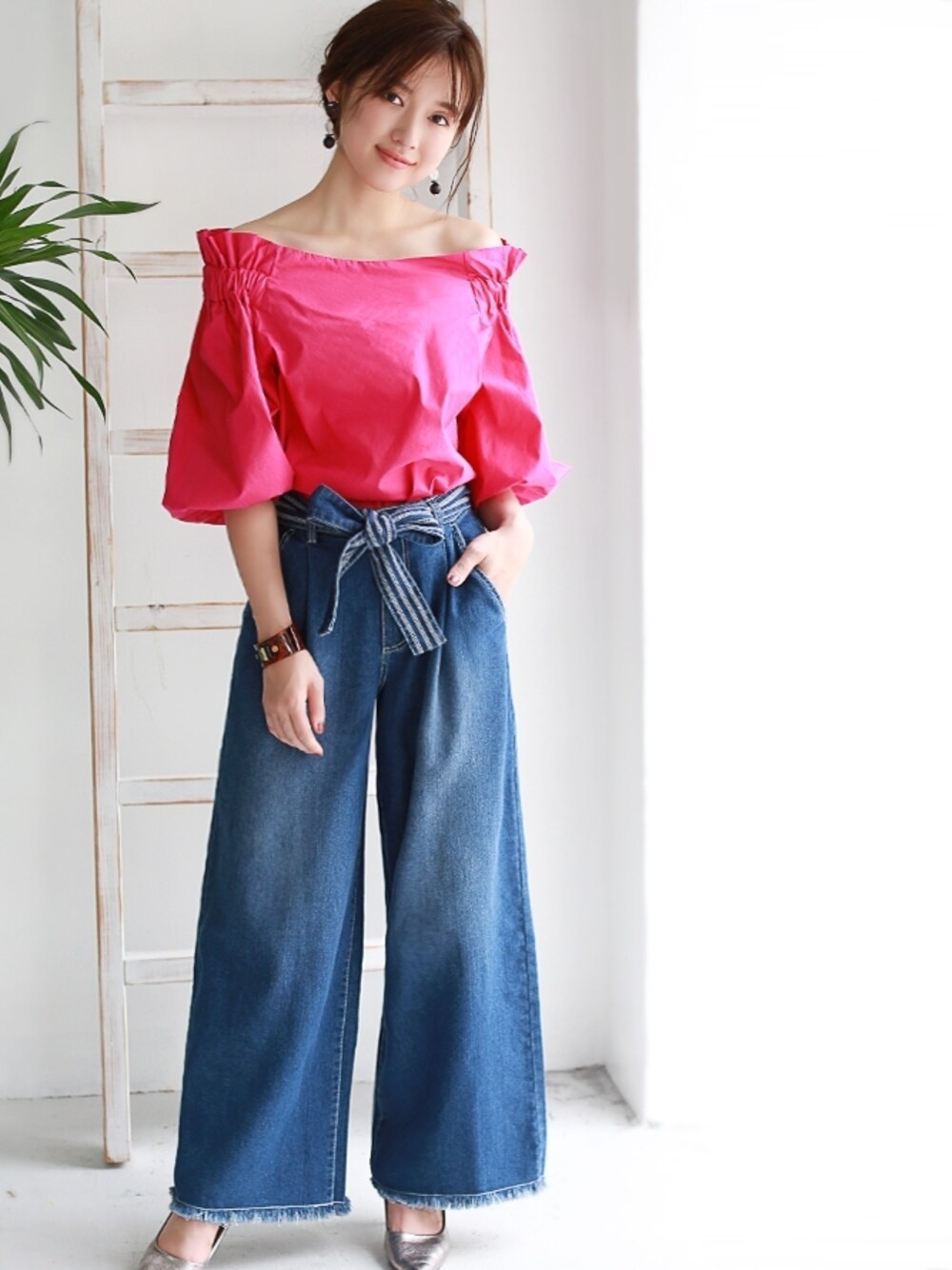 REALCUBEのシャツ/ブラウス「REAL CUBE バックリボンバルーンオフショルダーブラウス」を使ったコーディネート