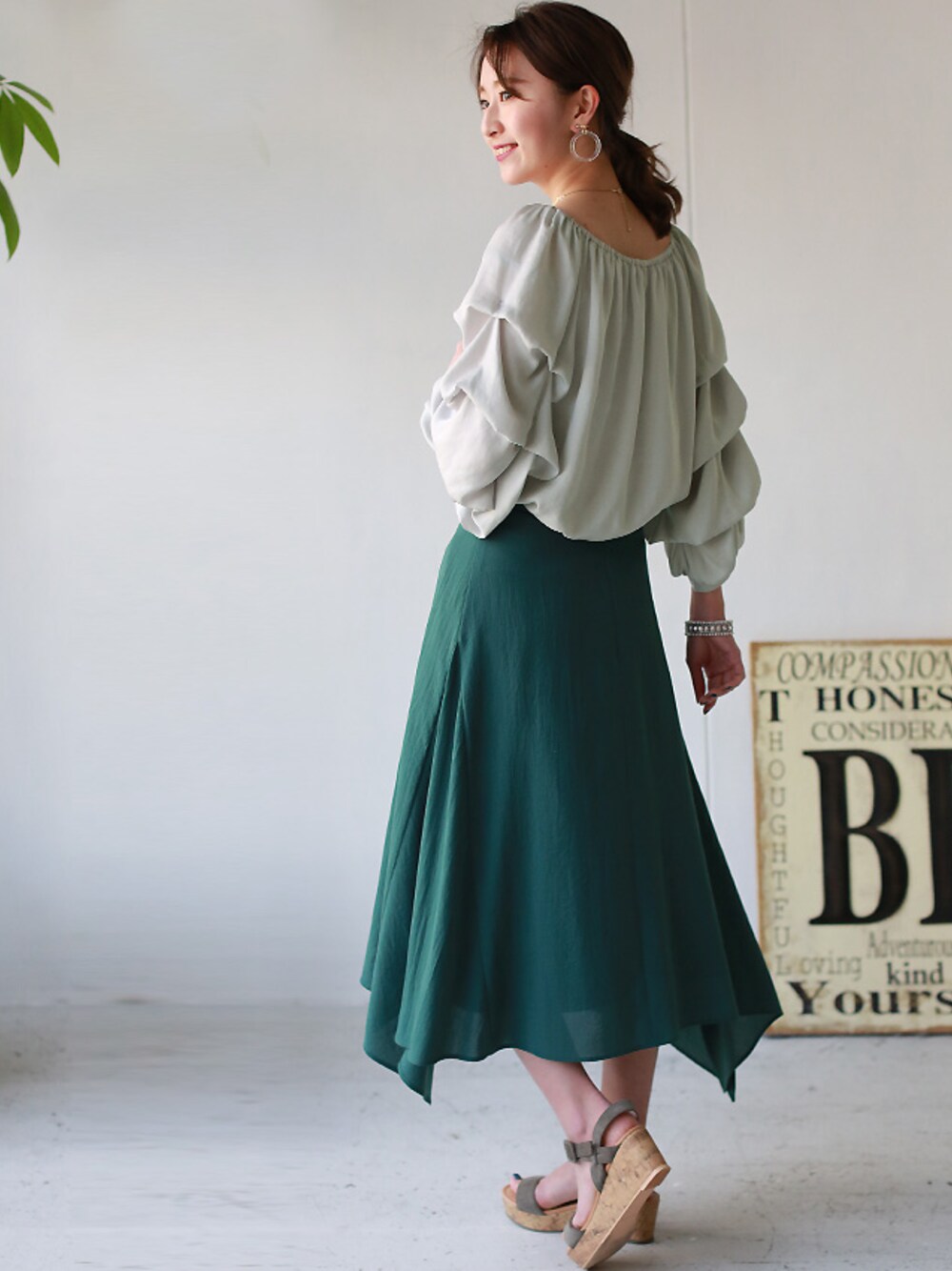 REALCUBEのシャツ/ブラウス「REAL CUBE サテンタックスリーブ2wayブラウス」を使ったコーディネート