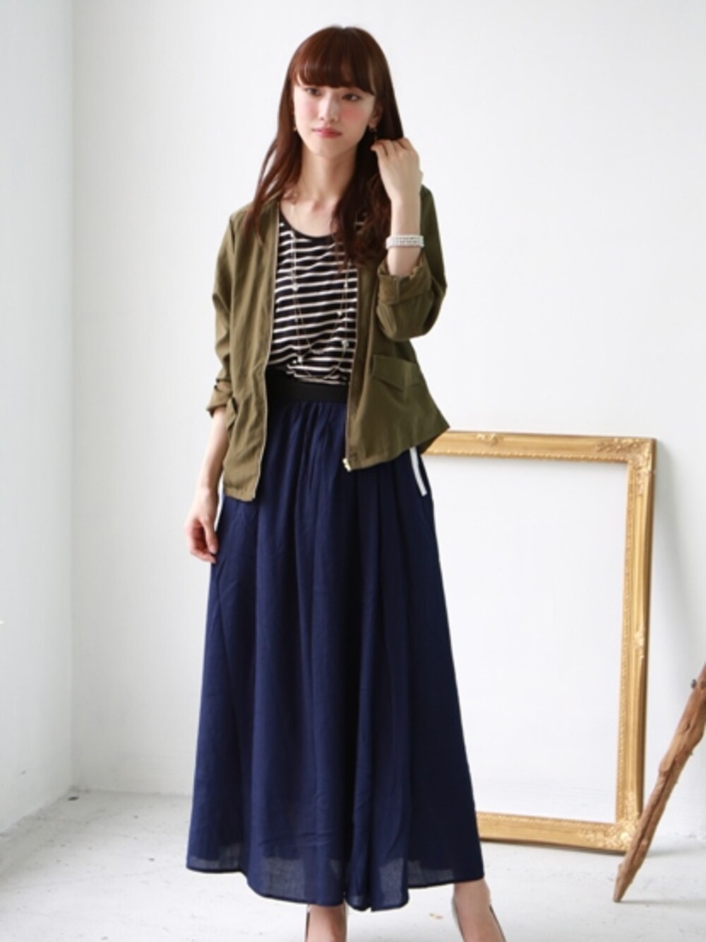 REALCUBEのスカート「REAL CUBE ウエストゴム楊柳ロングスカート」を使ったコーディネート