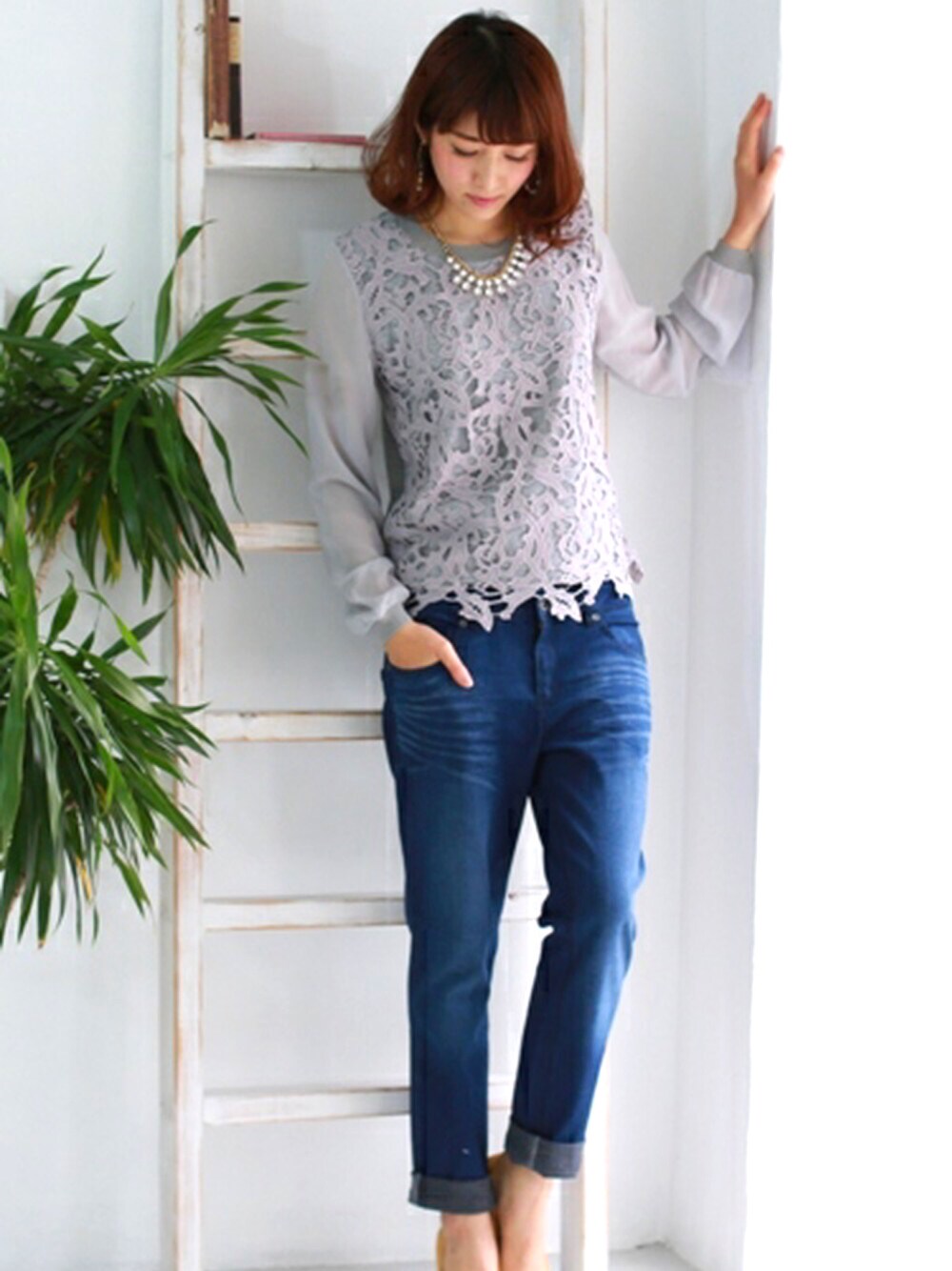 REALCUBEのTシャツ/カットソー「REAL CUBEフロントレースシフォン切替プルオーバー」を使ったコーディネート