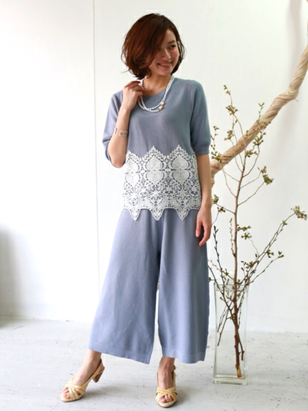 REALCUBEのTシャツ/カットソー「鹿の子ワイドレースニットセットアップ【パンツタイプ】」を使ったコーディネート