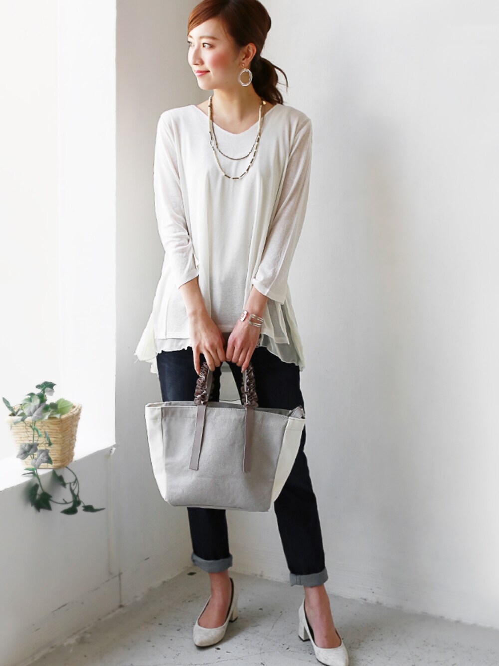 REALCUBEのトートバッグ「REAL CUBE グログランリボンフリルハンドルトートバッグ【Mサイズ】 ショルダーストラップ付」を使ったコーディネート