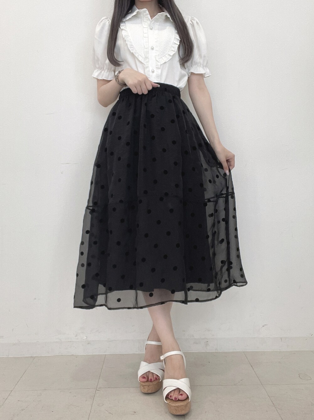 🐈⬛🖤 モノトーンでまとめたガーリーコーデ ハート型のフリルがかわいいブラウスですᐡ- ̫ -ᐡ ♡