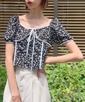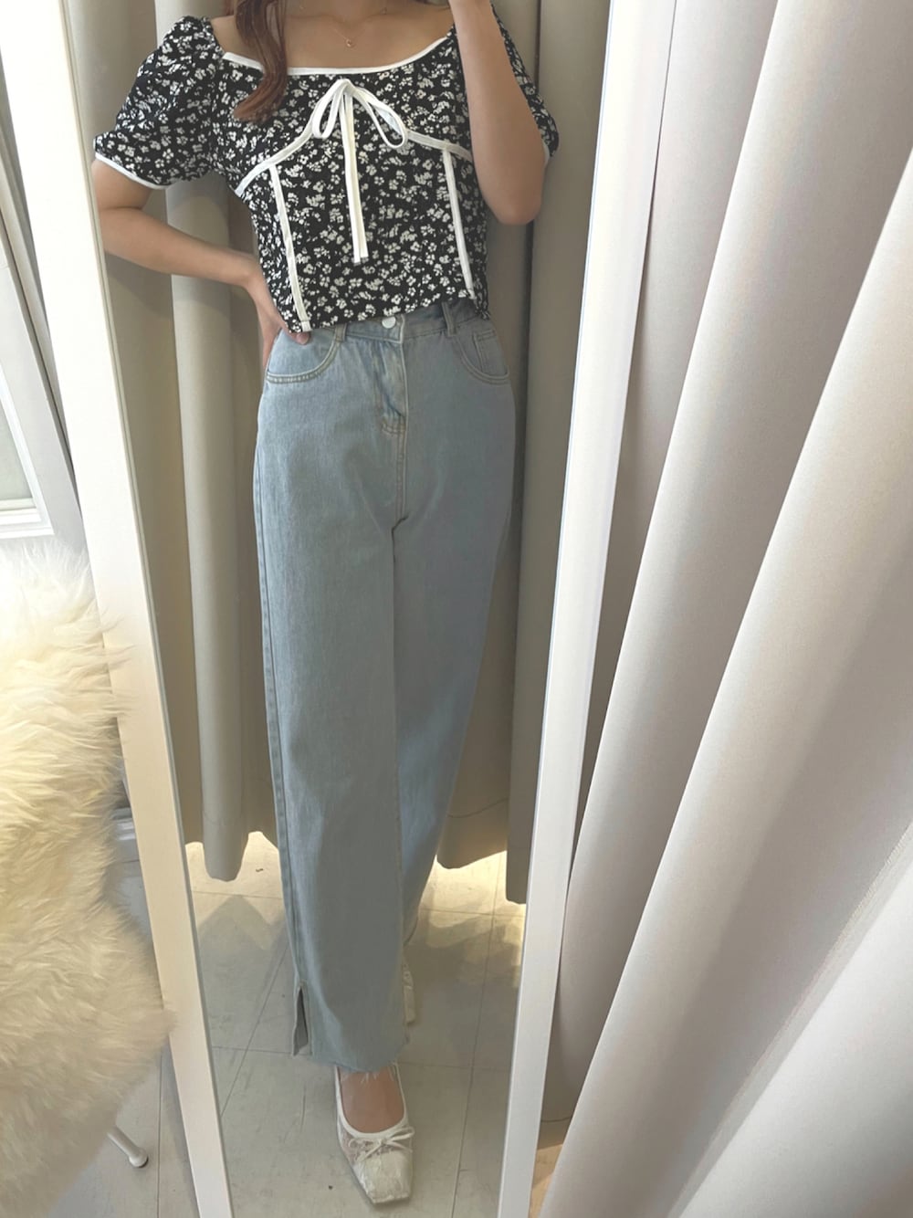 バイカラーのリボンがワンポイントのフラワー柄トップスにパンツを合わせたカジュアルガーリーコーデ❣️パンツはデニム素材にスリット入りでさり気ない肌見せも✨