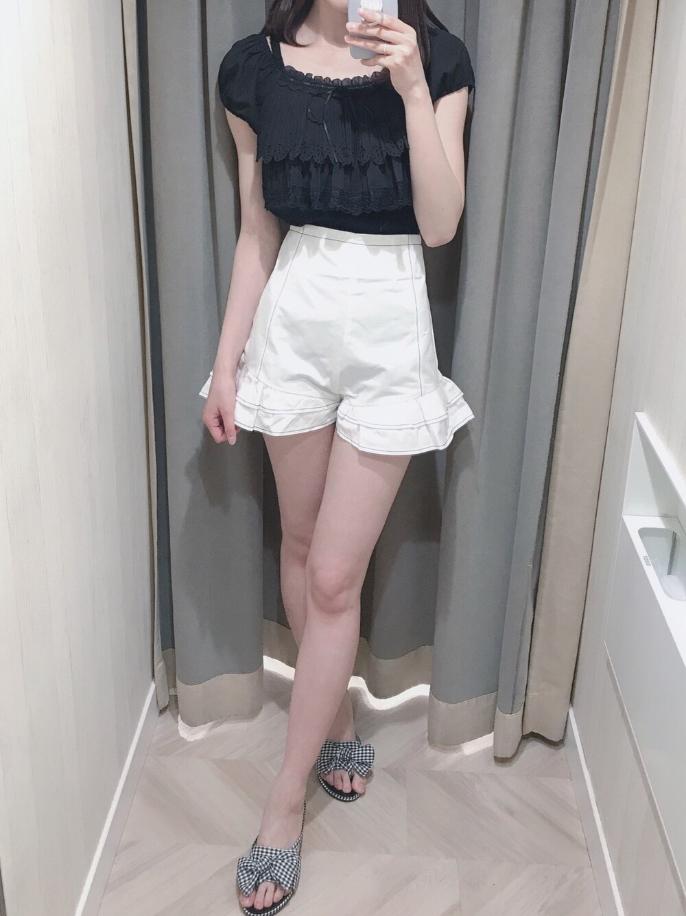 ホワイトカラーのショートパンツを合わせると 一気に夏気分がアップ🍧🤍 少しだけ角度をつけたフリルで脚を細見え✨ サンダルもローヒールでとっても履きやすいのがお気に入り💓
