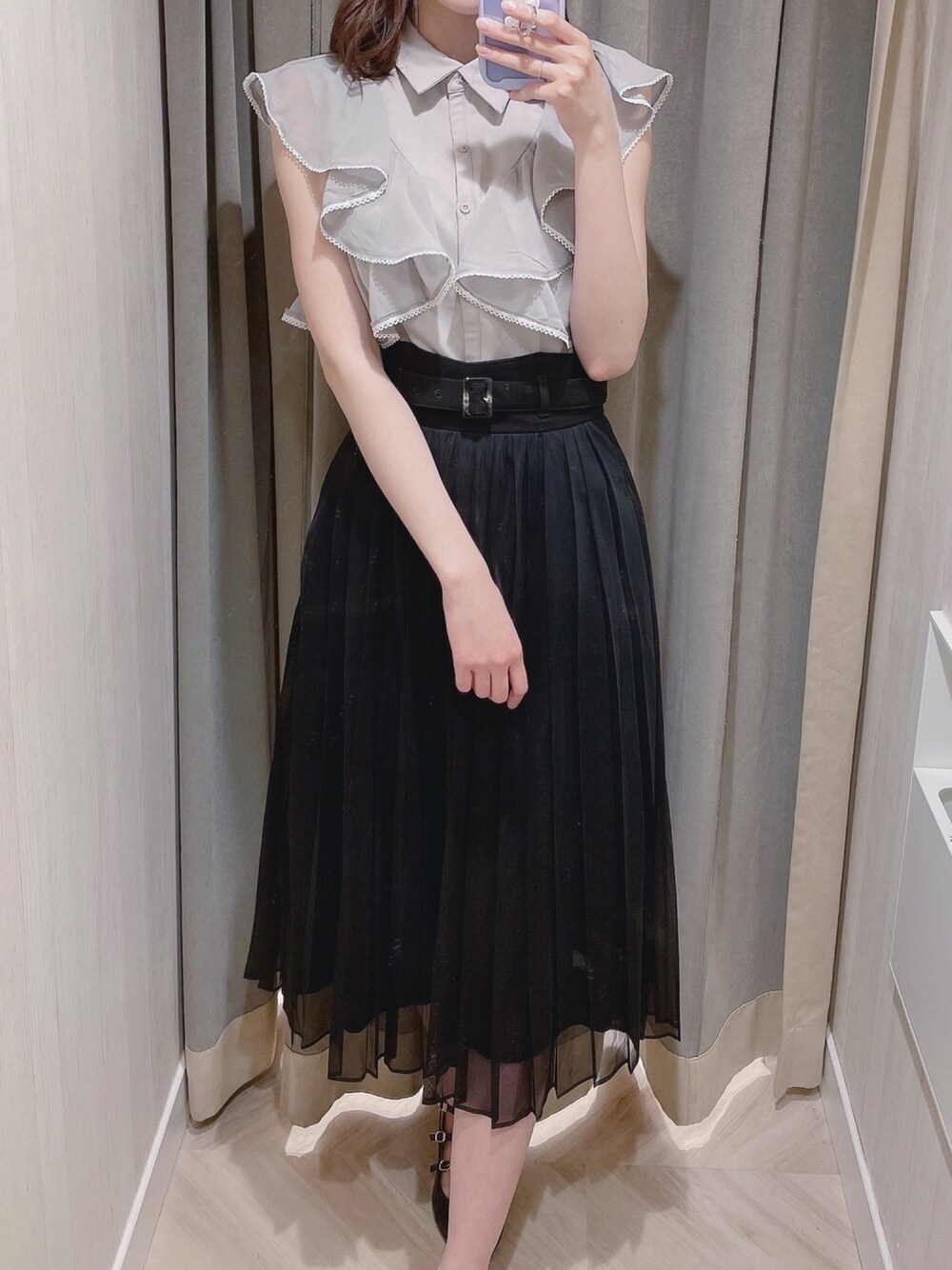 モノトーンコーデ 🐩🐈⬛ ブラウスはフリルに透け感があるので肩がガッツリしなくて着やすい🤍