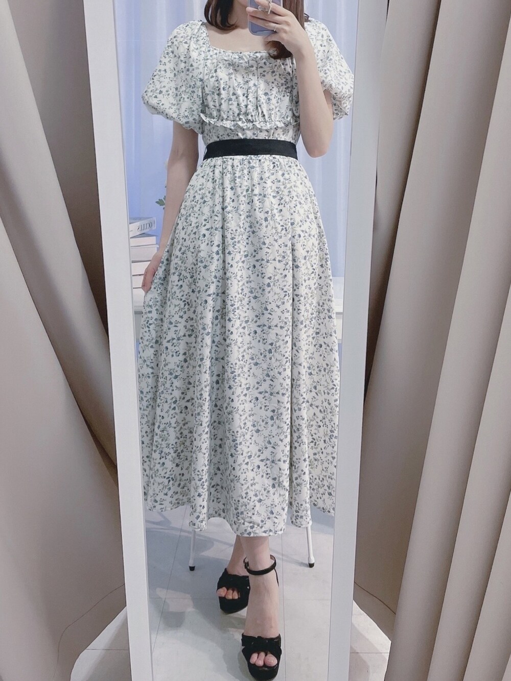 白地に青の小花柄が上品で大人な可愛さ🕊 ボリューム感のあるパフスリーブが細見えさせてくれました☁️ 仕上げにスクエアネックで抜かりない装いに♡