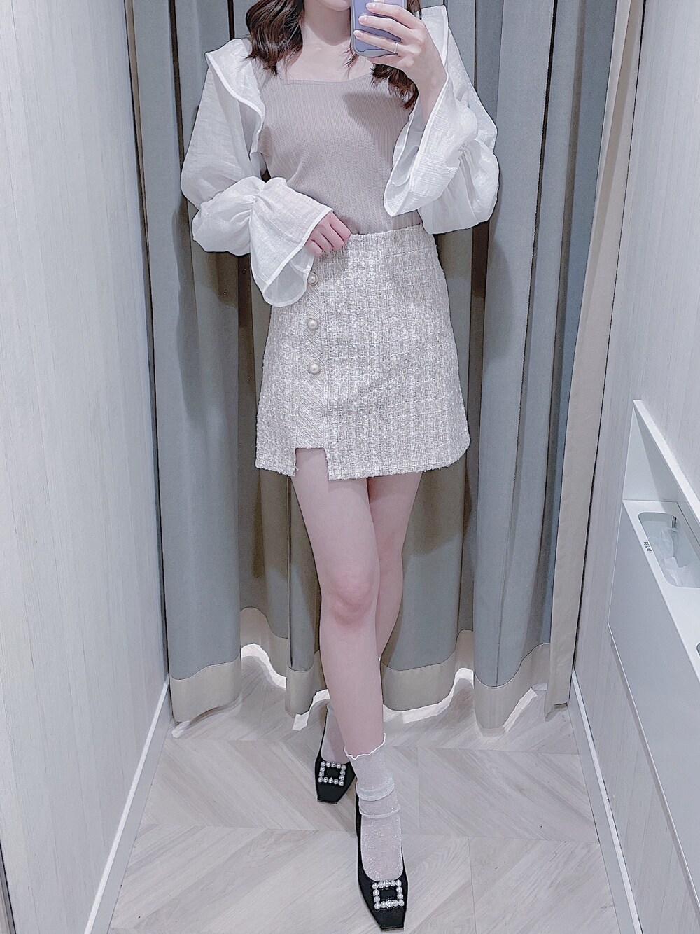 キラキラピンクの韓国っぽコーデ🍑💗 トップスは 手元にかぶるくらいの袖の長さが可愛すぎるっ😣 ラメ混のツイードスカートは色味に一目惚れ🤍
